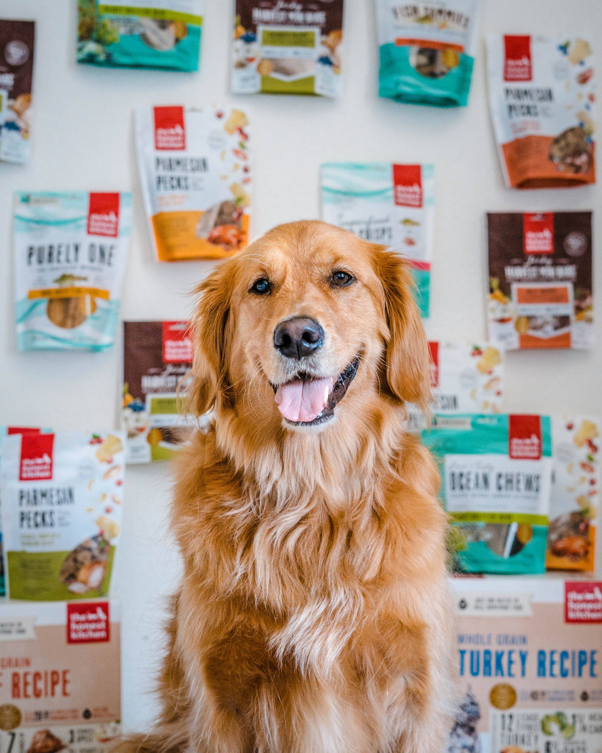 A dog with it's head in a shopping hand basket filled with The Honest Kitchen Products. In Store Rewards The Honest Kitchen.